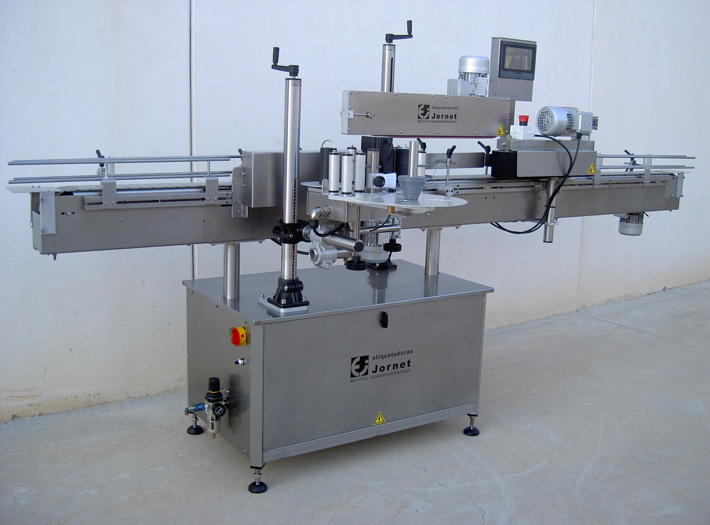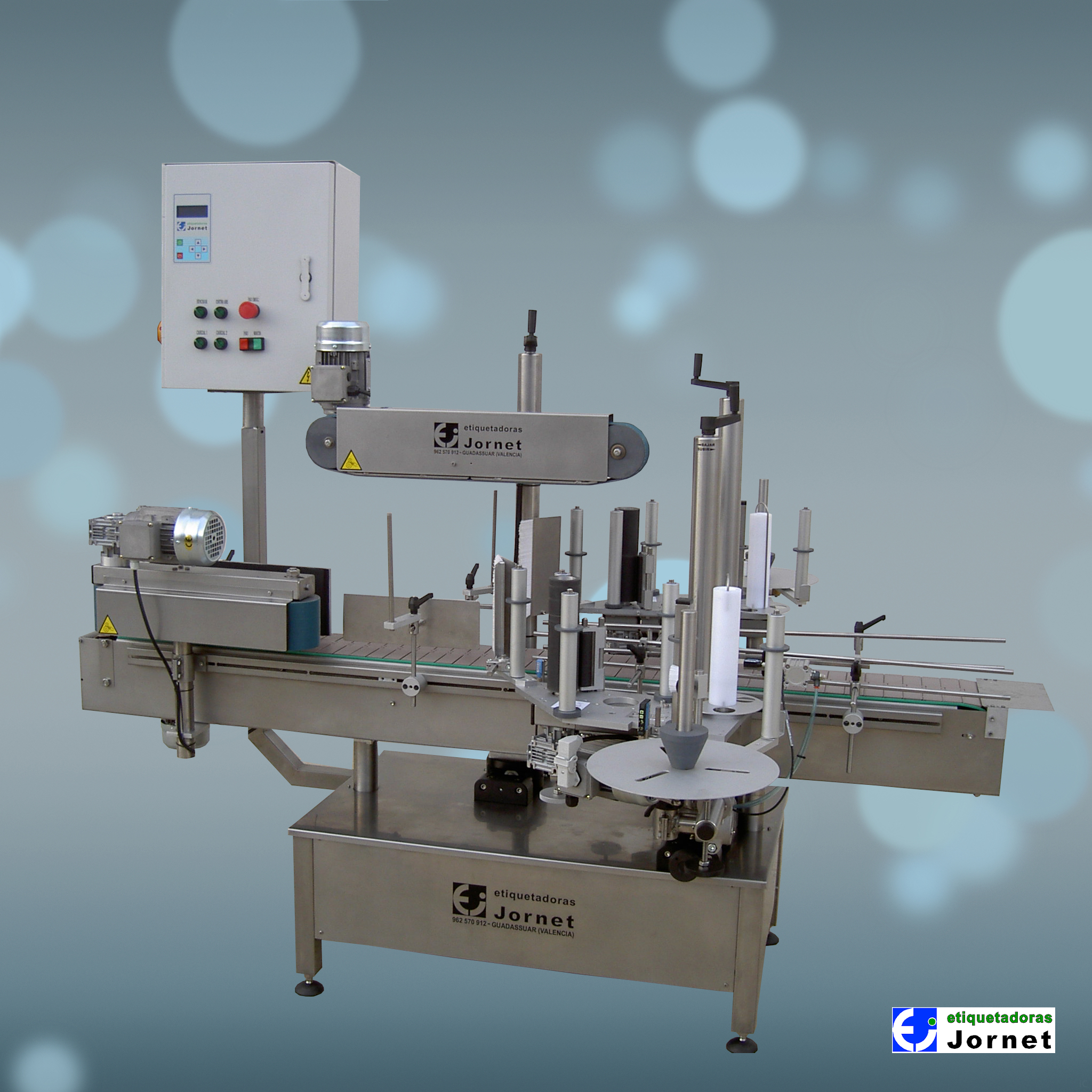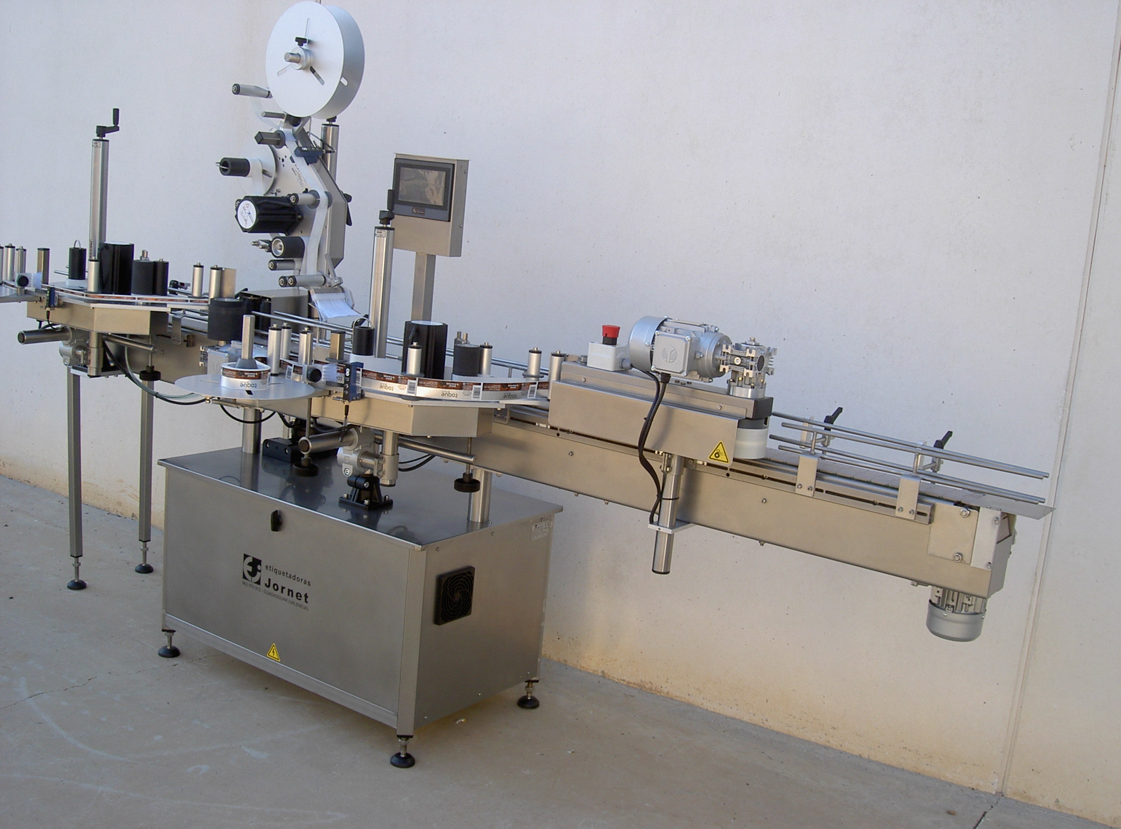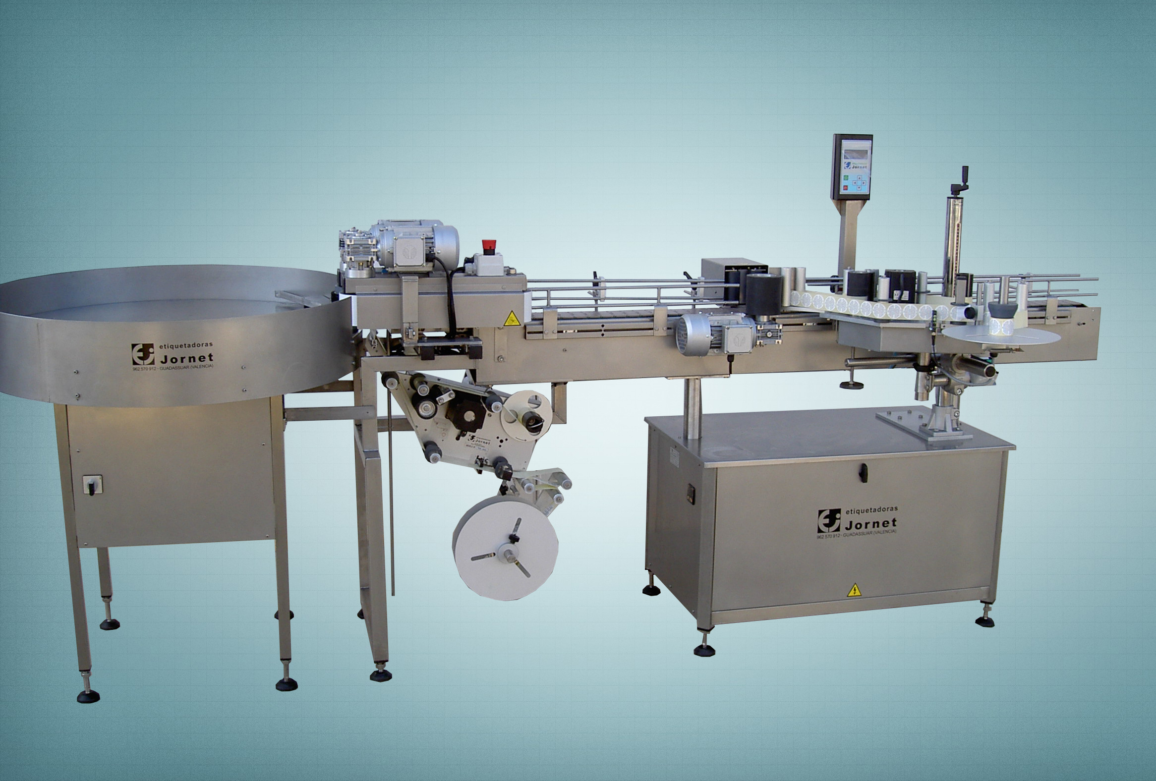 Esta línea permite la colocación de etiqueta, contraetiqueta y precinto en cualquier tipo de envase cilíndrico, al igual que la colocación de una etiqueta superior en cualquier tipo de envase.