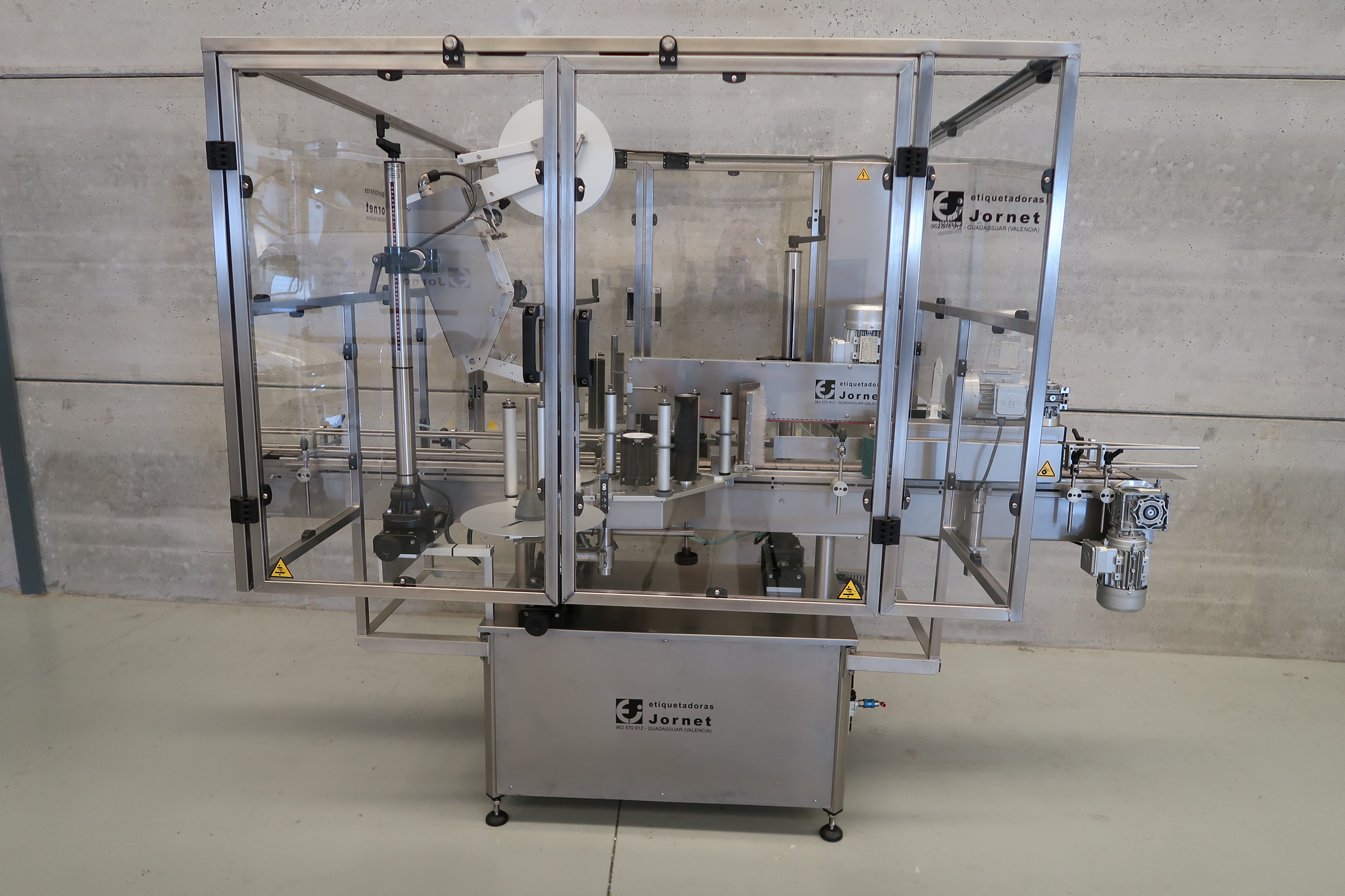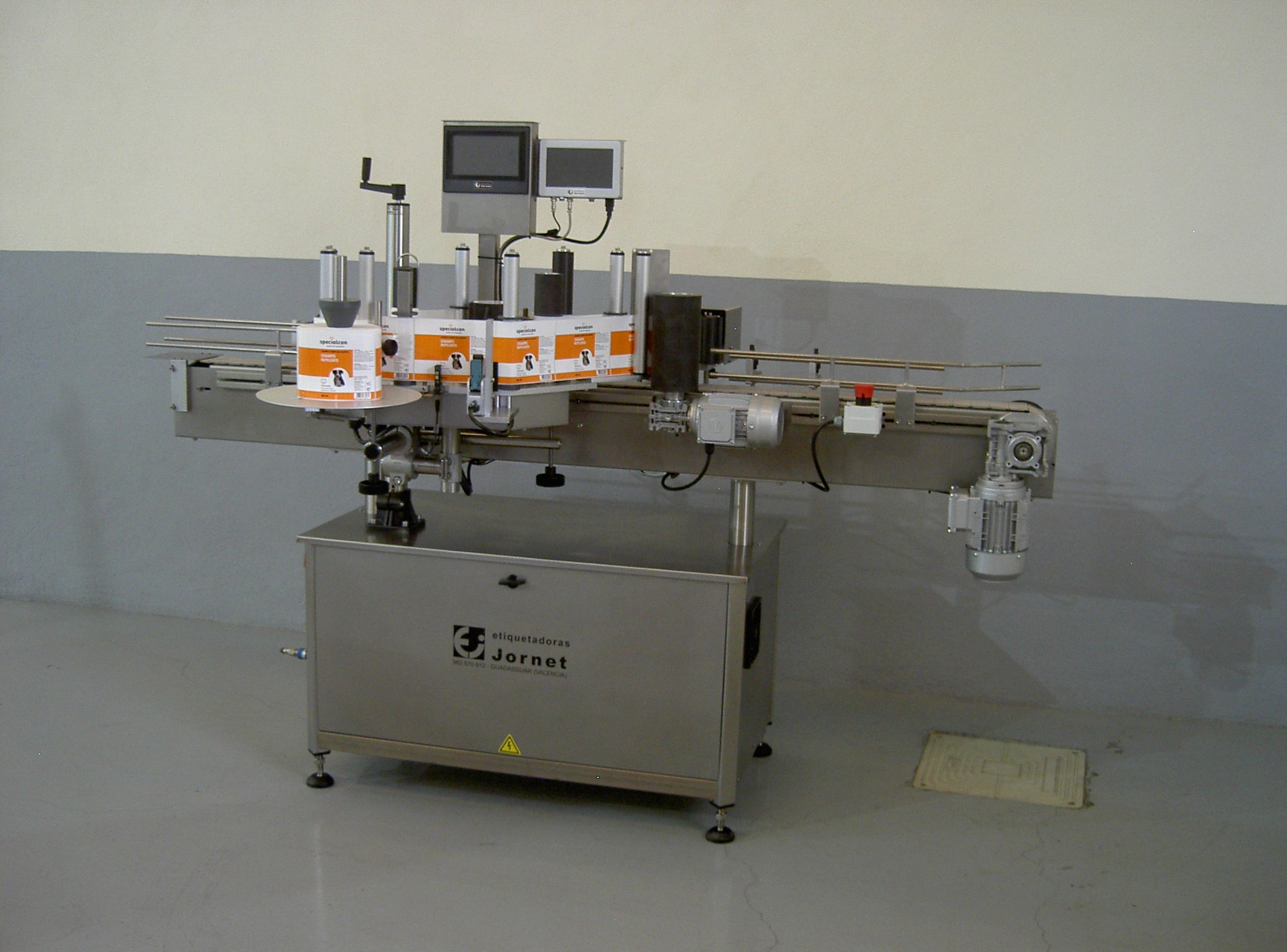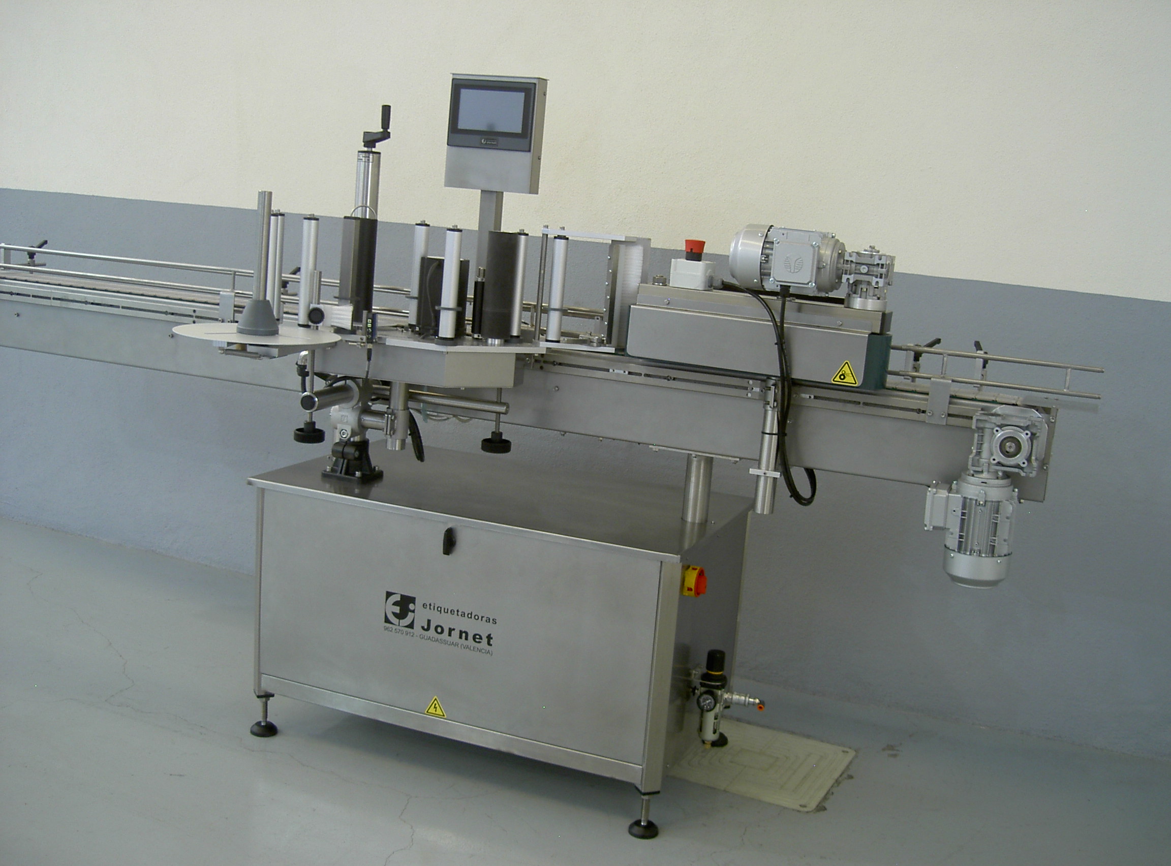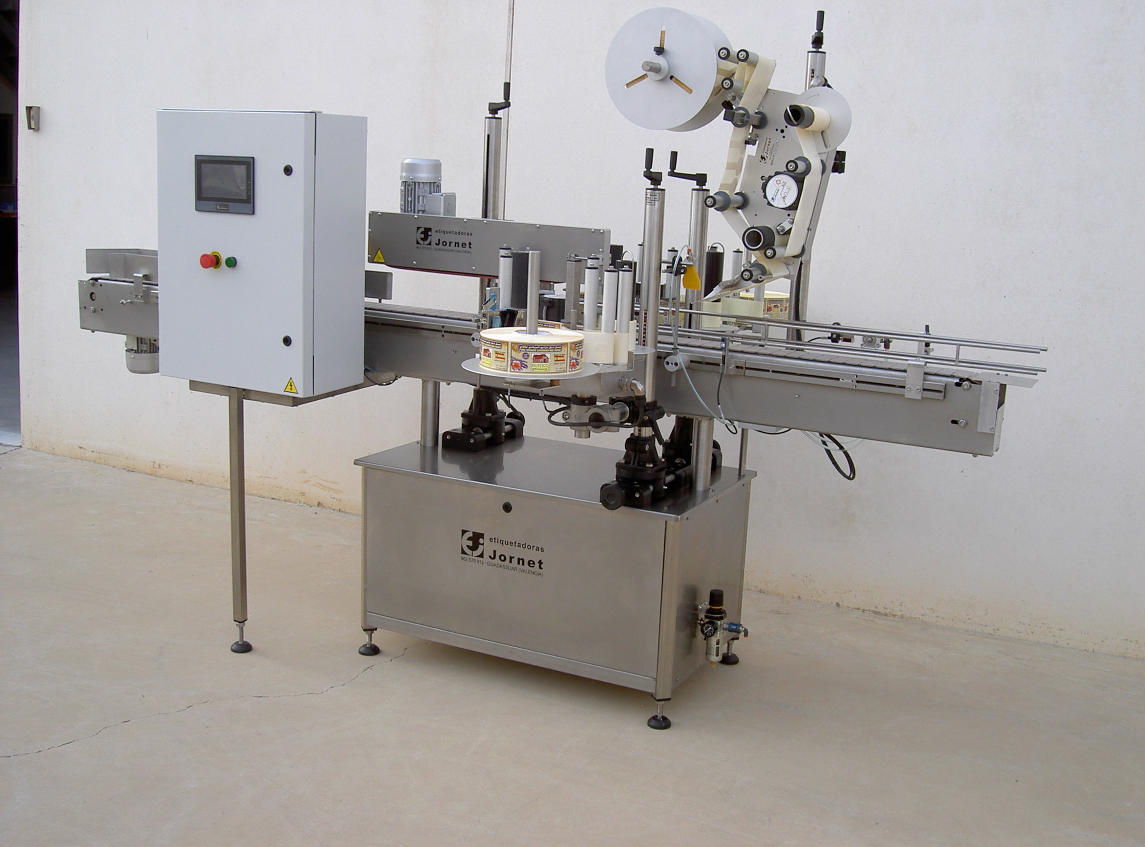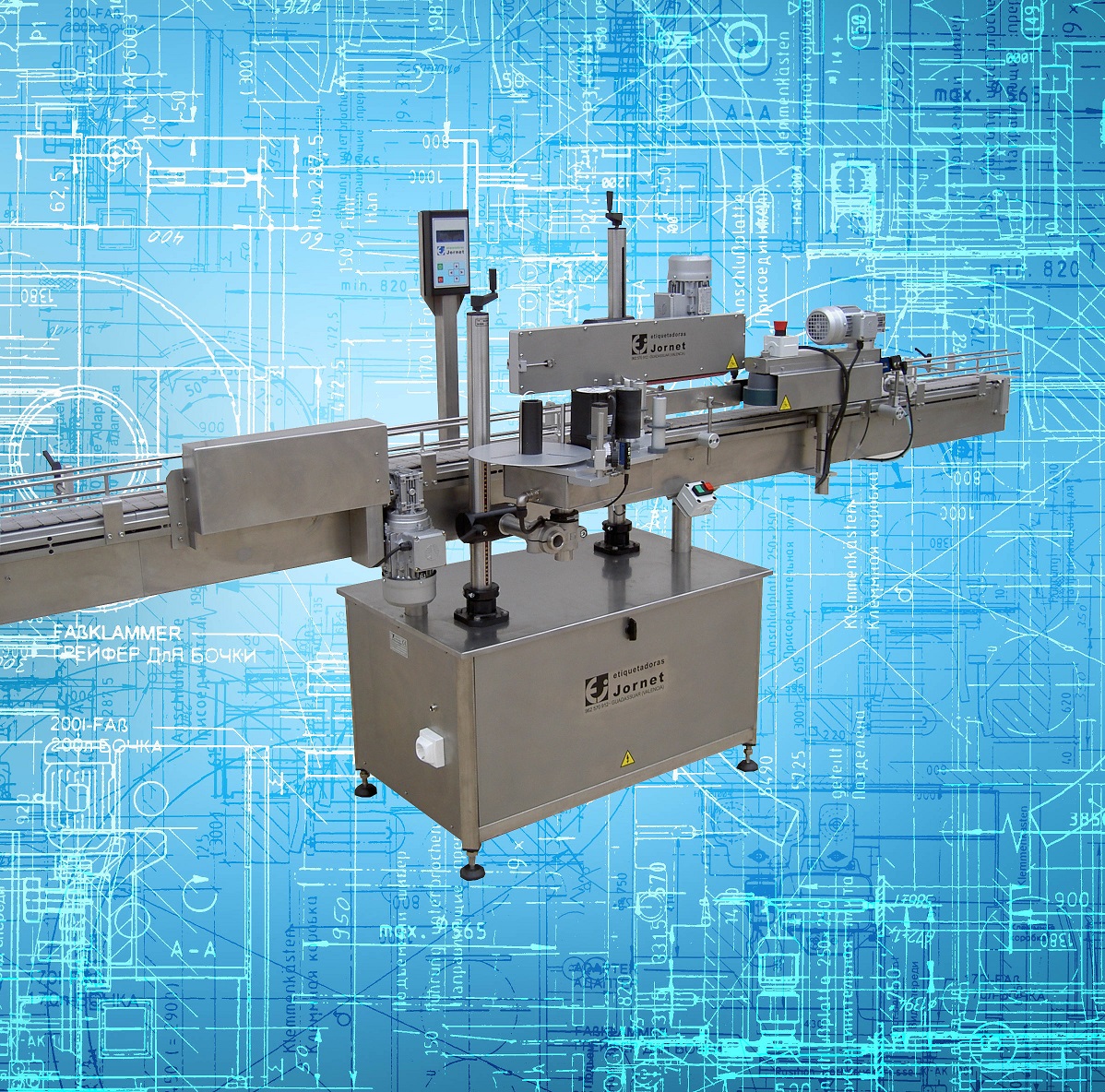 Esta línea permite la colocación de etiqueta, contraetiqueta y precinto en cualquier tipo de envase cilíndrico, al igual que la colocación de una etiqueta superior en cualquier tipo de envase.